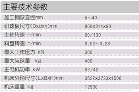 本機床采用臥式布局和循環加工方式。主機床身重約5000kg,內部加強筋布局合理,以提高強度,機床耐沖擊性和抗變形能力增強。主機與主傳動分離,料盤采用傾斜方式,料盤的旋轉采用交流變頻調速。進球口處增加爬球坡道,直接從料盤切線處進球。加壓方式采用液壓驅動,蓄能器保壓裝置。通過改變雙速電機的極數可得到主軸兩檔轉速。