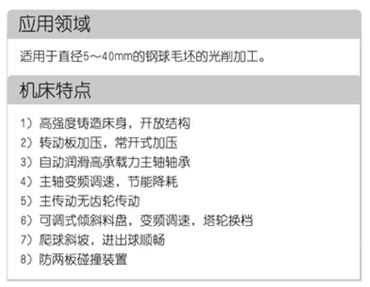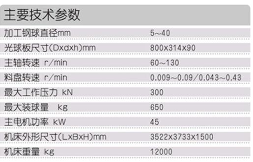 本機床采用臥式布局和循環加工方式。主機床身重約5000kg,內部加強筋布局合理,以提高強度,機床耐沖擊性和抗變形能力增強。料盤采用傾斜方式,料盤的旋轉采用交流變頻調速。進球口處增加爬球坡道,直接從料盤切線處進球。加壓方式采用液壓驅動,蓄能器保壓裝置。主軸采用變頻無級調速。